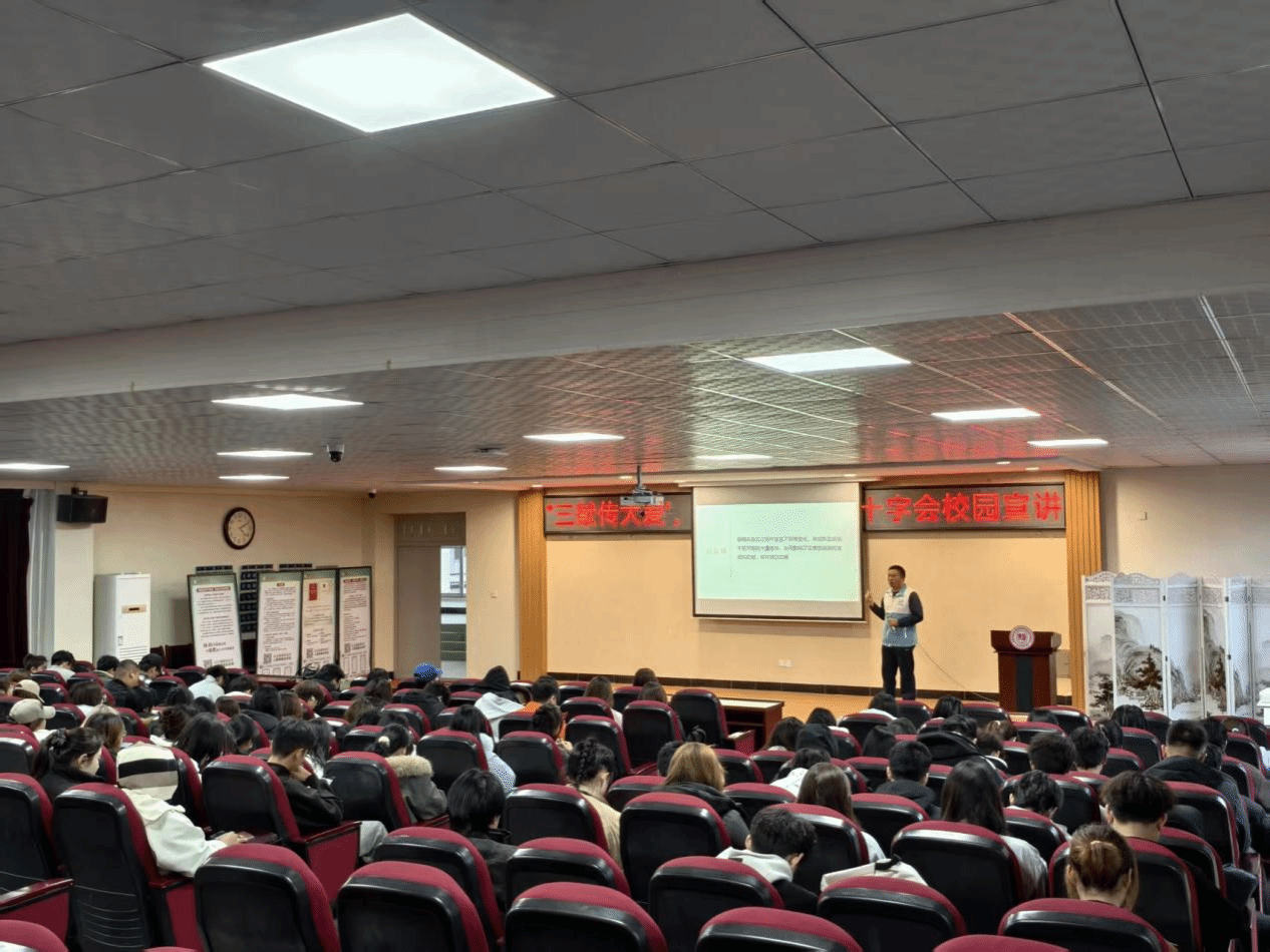 市红十字会捐献造血干细胞志愿服务队队长陈志刚,为师生普及有关捐献造血干细胞的相关流程及血液知识。他用自己的亲身经历为同学们讲解造血干细胞可以为病患带来二次生命,鼓励同学们更多地关注三献公益事业。现场同学积极参与互动,加深对红十字会公益活动的了解。