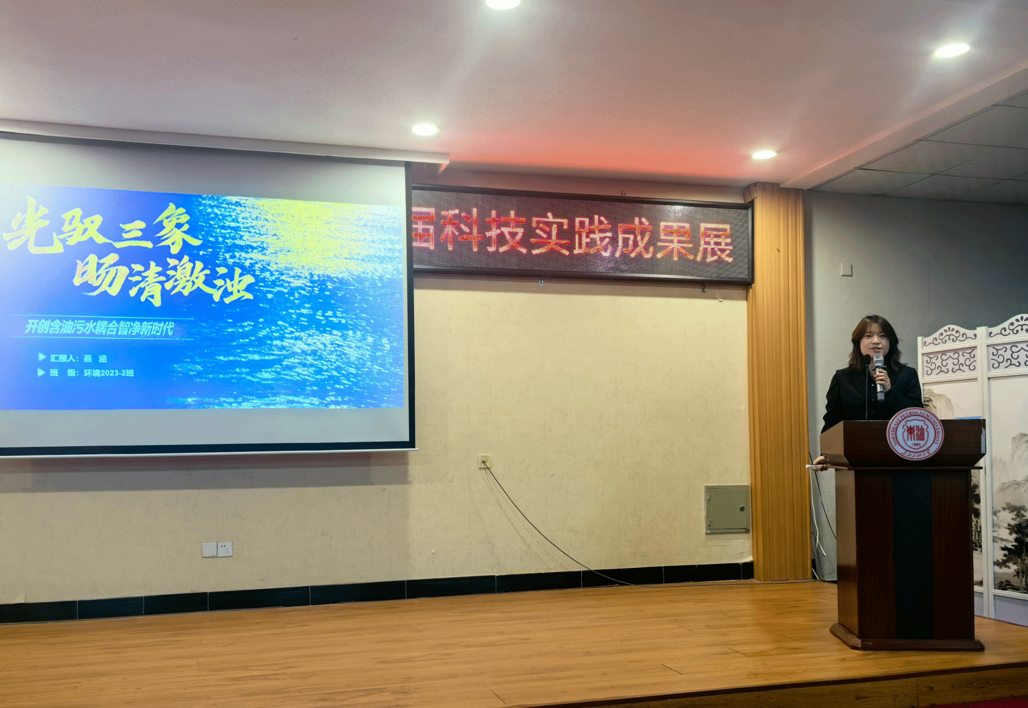 石化系环境23-2班聂涵同学展示了大创赛国家铜奖作品——含油污水耦合智净新时代。