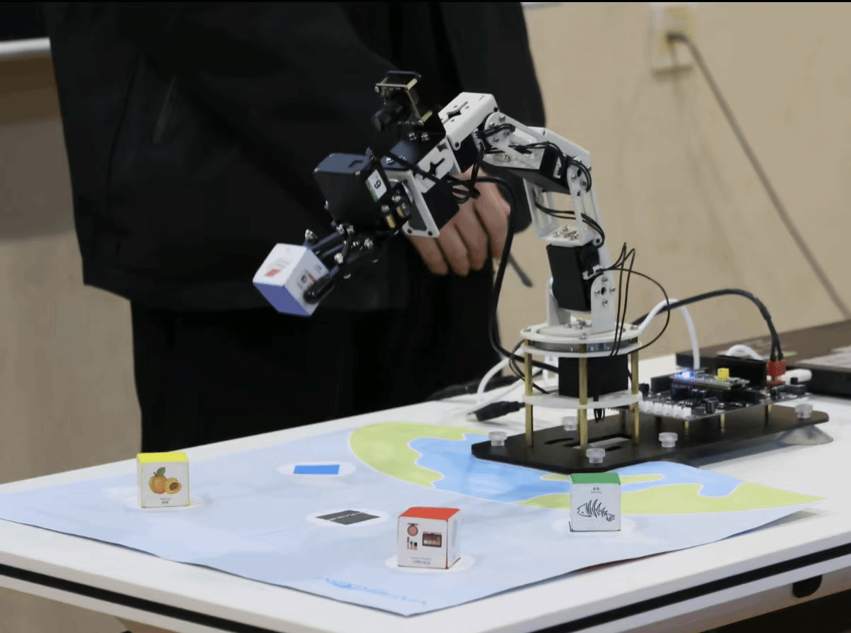 电信系机器人AI大赛冠军,机器人24-4班的赵浩然同学带着AI机械臂和AI机械小车亮相舞台,为现场观众展示了机械臂抓取色块,小车自动识别线路等内容。