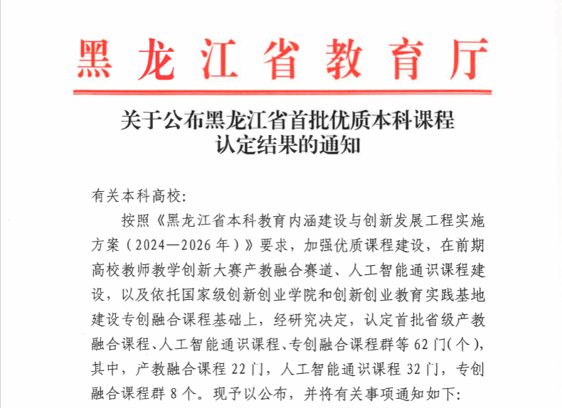 (通讯员 吕明洋)近日,黑龙江省教育厅公布了首批优质本科课程认定结果,学校共有6门课程被认定为优质本科课程。校区石油与化学工程系郑立辉主持的《水污染控制工程》和大数据与计算机科学系段鸿轩主持的《人工智能AIGC基础与应用》两门课程,分别获批产教融合类和人工智能通识类的本科优质课程。