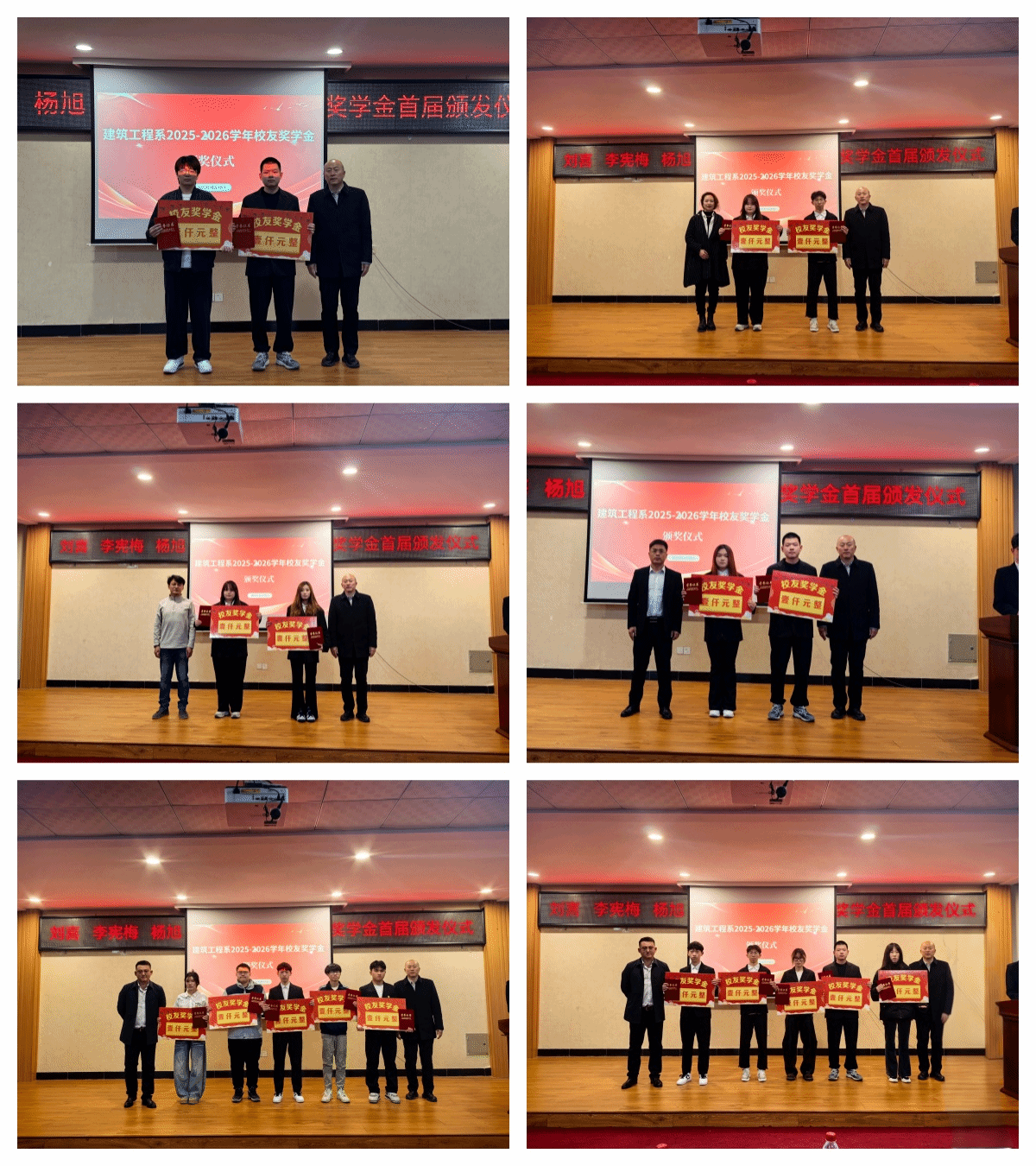 校友奖学金由刘喜、李宪梅、杨旭、齐春光、李树丰五位校友分别设立,奖学金遴选范围涵盖国家奖学金、综合测评成绩、四六级外语、学生竞赛、家庭条件等方面。奖学金的设立不仅是对学生的表彰,还是一种传承与激励,寄托着校友对母校及系部的感恩之心、回馈之情,更是校区多年来践行“以学生为中心”办学理念的积极反馈。相信建筑工程系学子将以更饱满的热情投身学习与实践,成长为优秀专业人才,为学校建设和社会发展贡献青春力量。