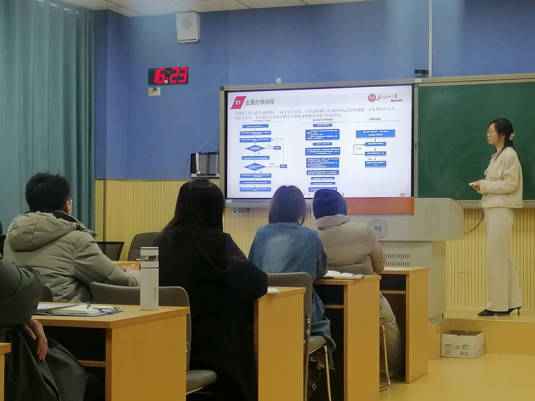 教务部主任王宪水以《高校教学运行流程规范化操作》为题,讲解了教务系统的功能、操作,课程教学流程。科研管理工作办公室主任吴琼以《科研项目申报与规范化管理》为题,以国家自然基金申报为例,解读了如何规范的申报课题以及在科研立项过程中会遇到的难点。组织人事部主任周红涛以《考勤制度、绩效文件、职称评审等文件相关解读》为题,解读了职称晋升、绩效考核、人事考勤等文件主要内容。
