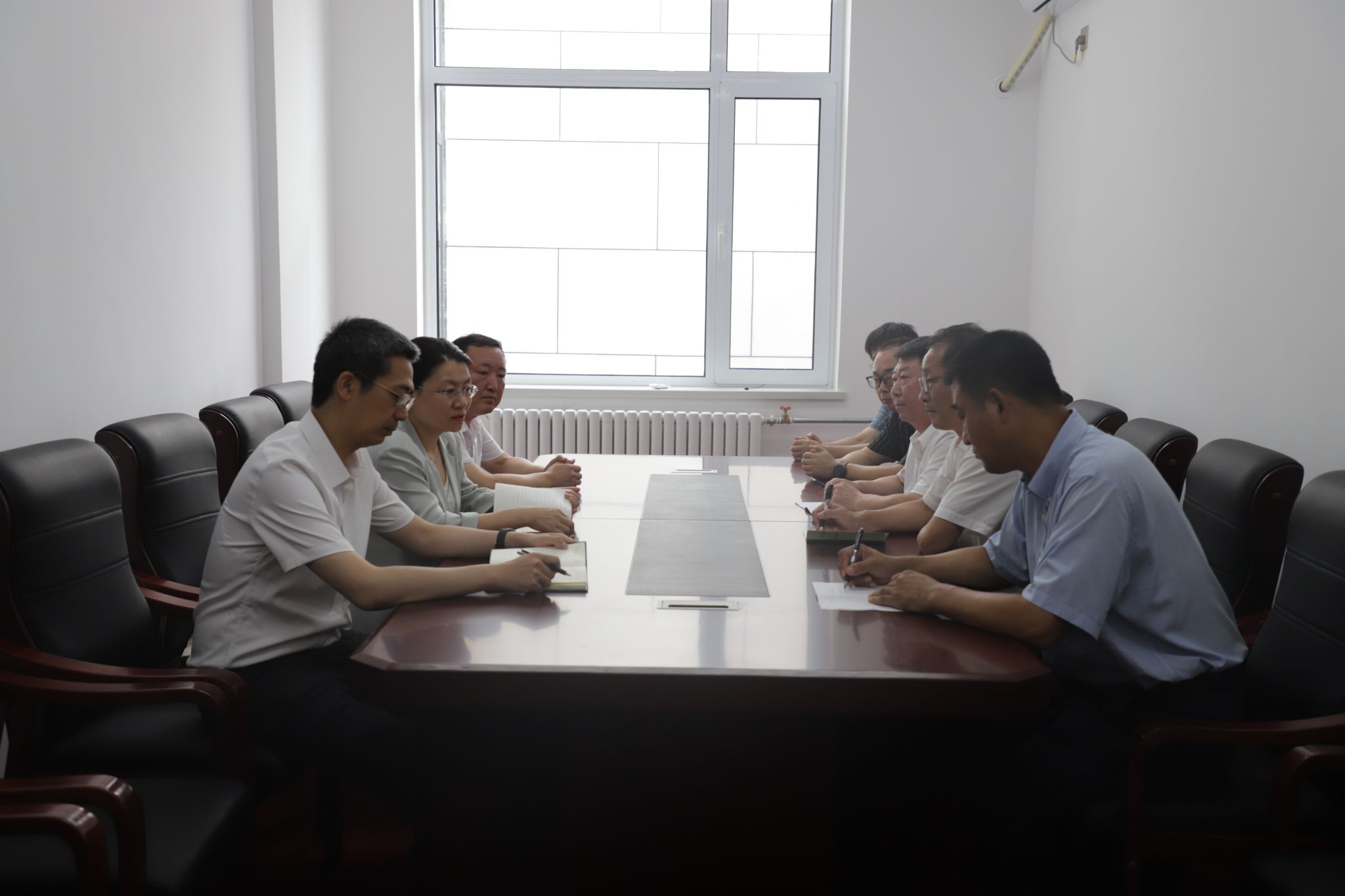 在科技文化交流中心会议室进行座谈交流,校区党委书记李正军、校长周宾,环渤海能源研究院院长任福深及相关领导参加座谈。周宾汇报了校区环境改造项目进展、教学科研一体化实验室建设、开学前准备工作等情况。