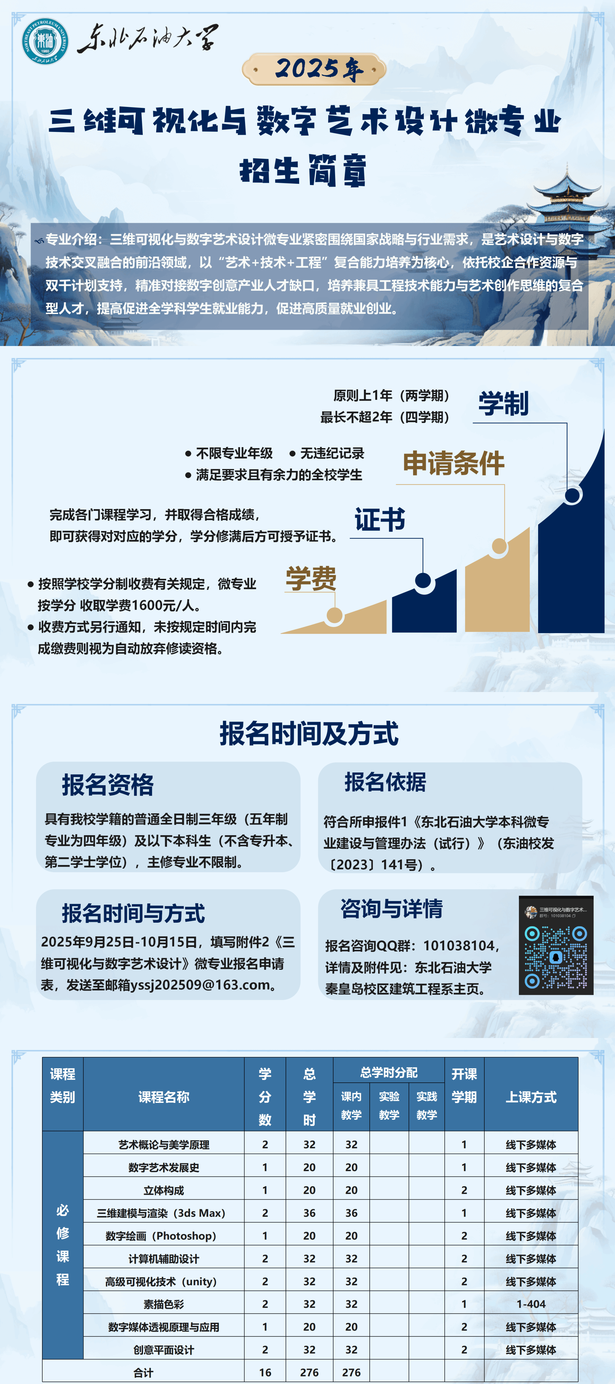 报名方式:填写附件2 《三维可视化与数字艺术设计》微专业报名申请表,发送至邮箱yssj202509@163.com。