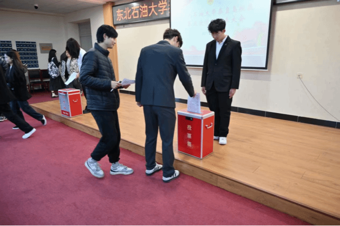 代表们针对竞选人的表现进行投票。根据投票结果,造价23级1班魏鑫慧同学当选东北石油大学秦皇岛校区第五届团委学生会执行主席,旅游(专升本)25级1班李雨泽和碳储23级1班姚林希同学为学生会主席团成员。
